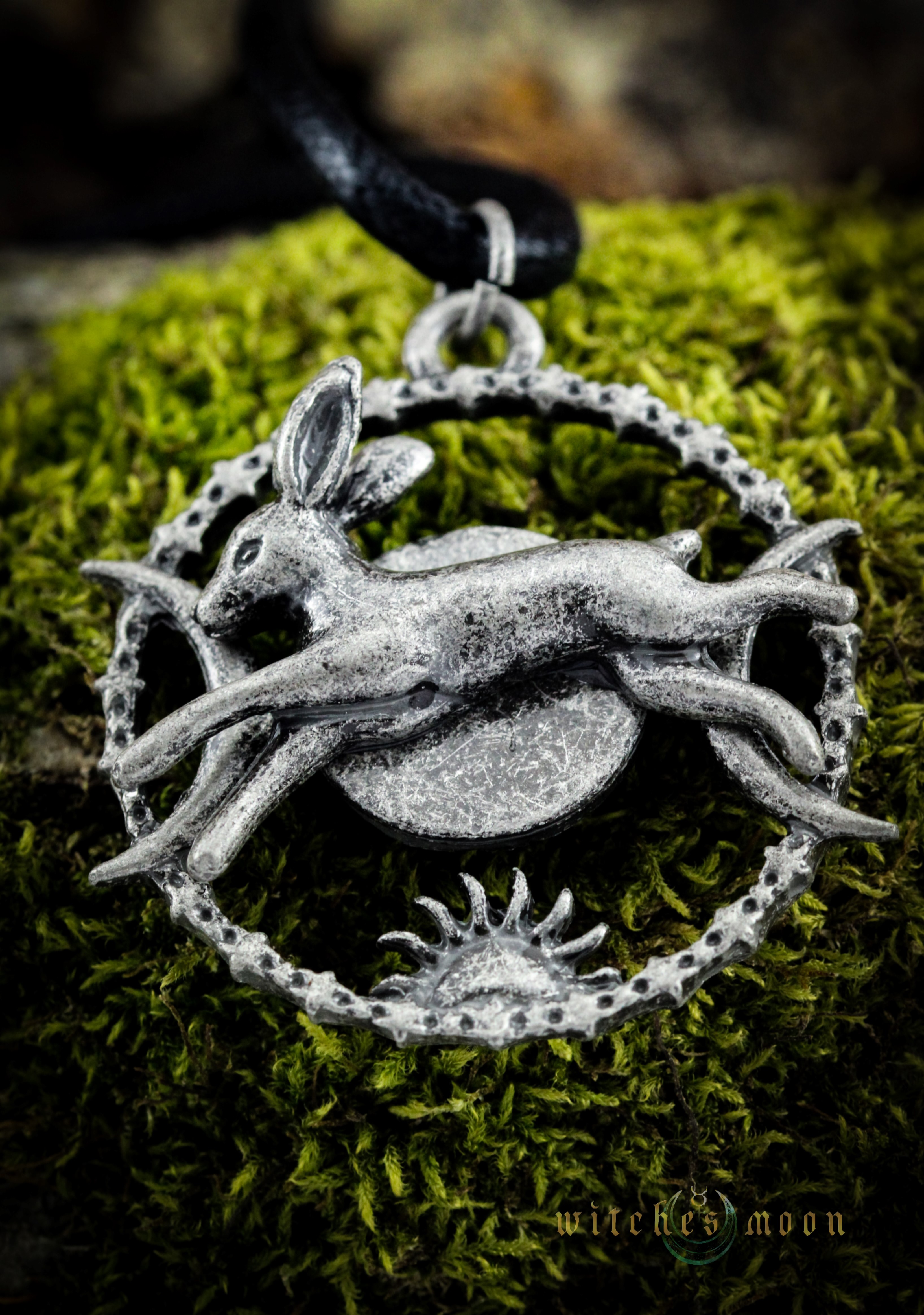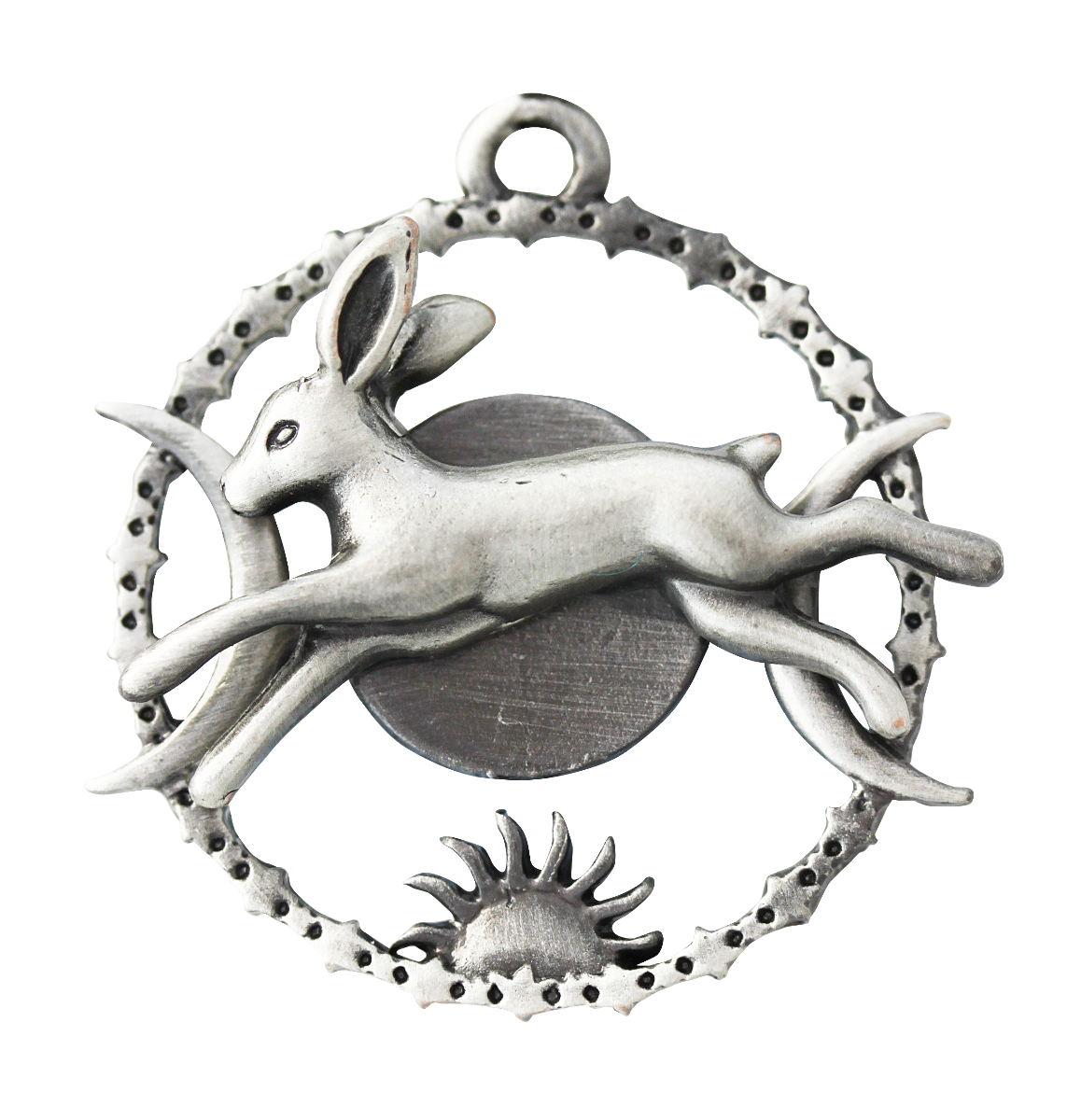 The hare, sacred child of the goddess, dances across the face of the full moon, ever-bright. Graceful in its zigzag path, it eludes the hunter. Mischievous, inventive, fertile, and beautiful, it is the totem animal of the Greenwood