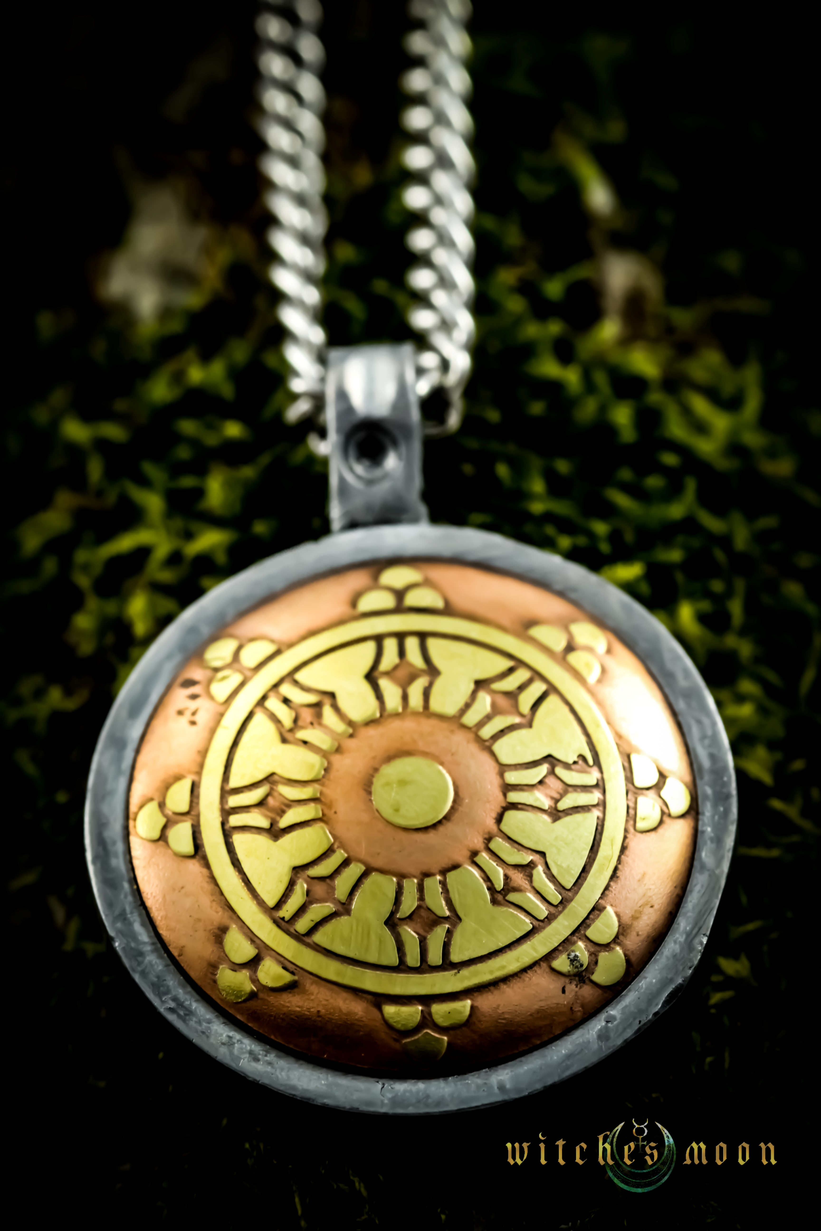 Finely crafted in brass and copper, a substantial talisman with magical powers drawn from the ancient wisdom of the symbols with which it is embossed. Supplied with a chain and a bespoke gift box.