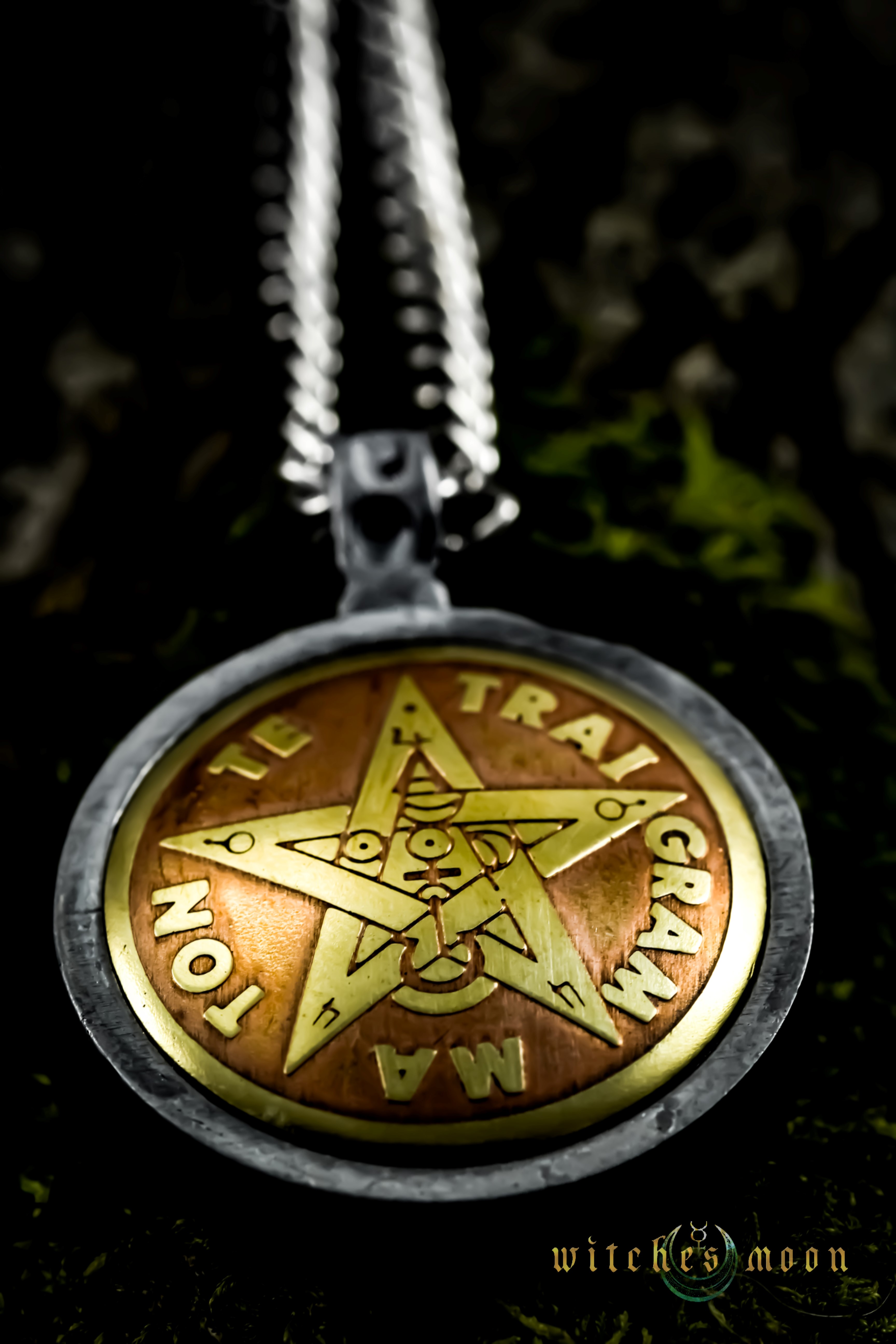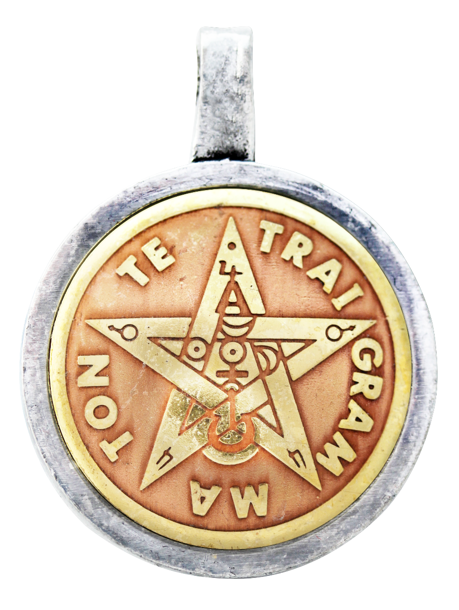 Finely crafted in brass and copper, a substantial talisman with magical powers drawn from the ancient wisdom of the symbols with which it is embossed. Supplied with a chain and a bespoke gift box.