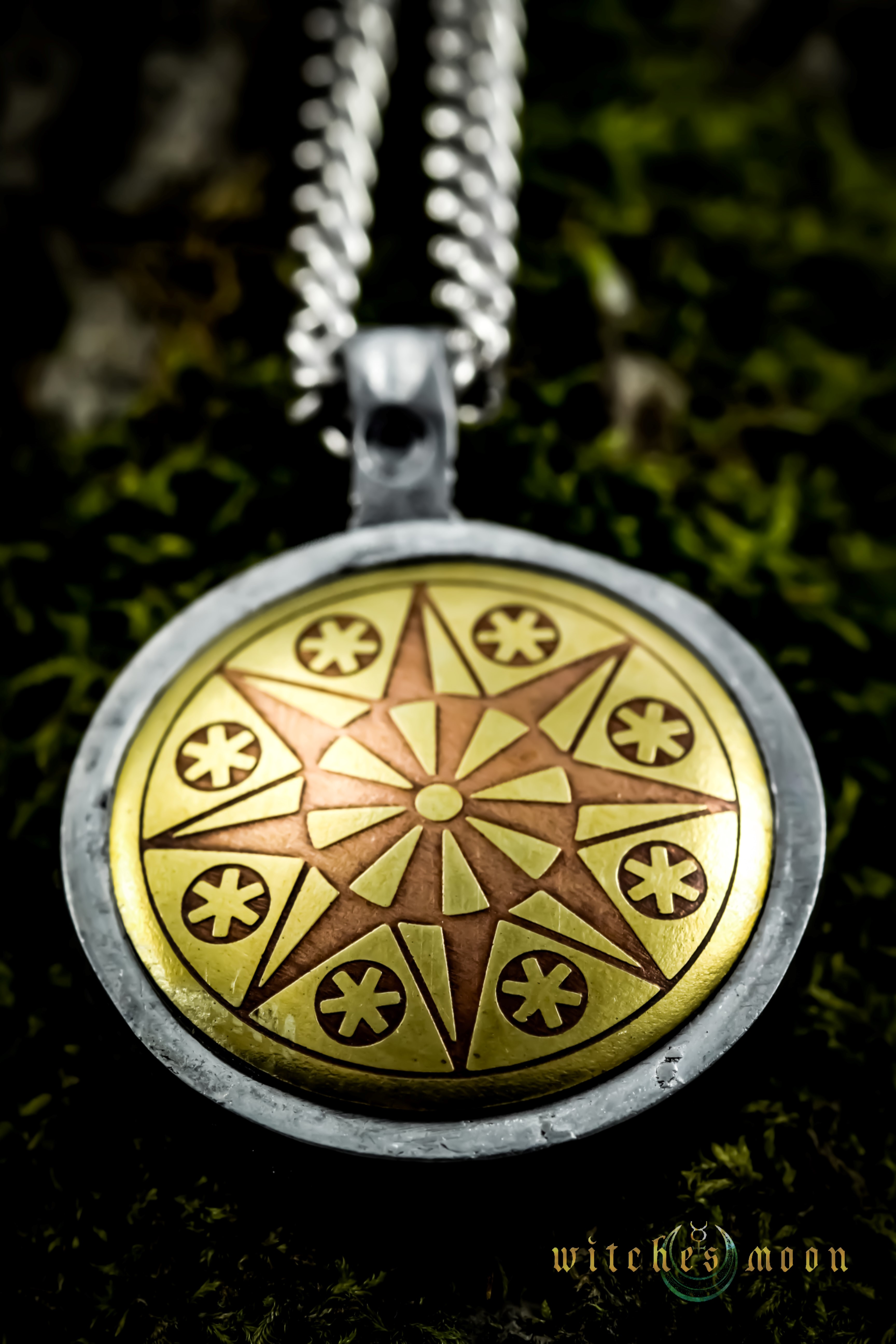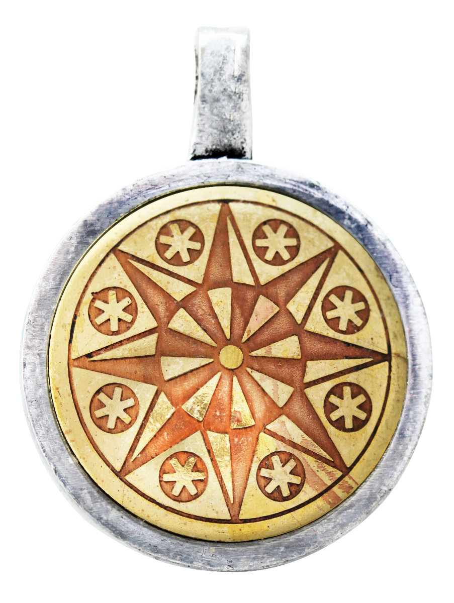 Finely crafted in brass and copper, a substantial talisman with magical powers drawn from the ancient wisdom of the symbols with which it is embossed. Supplied with a chain and a bespoke gift box.