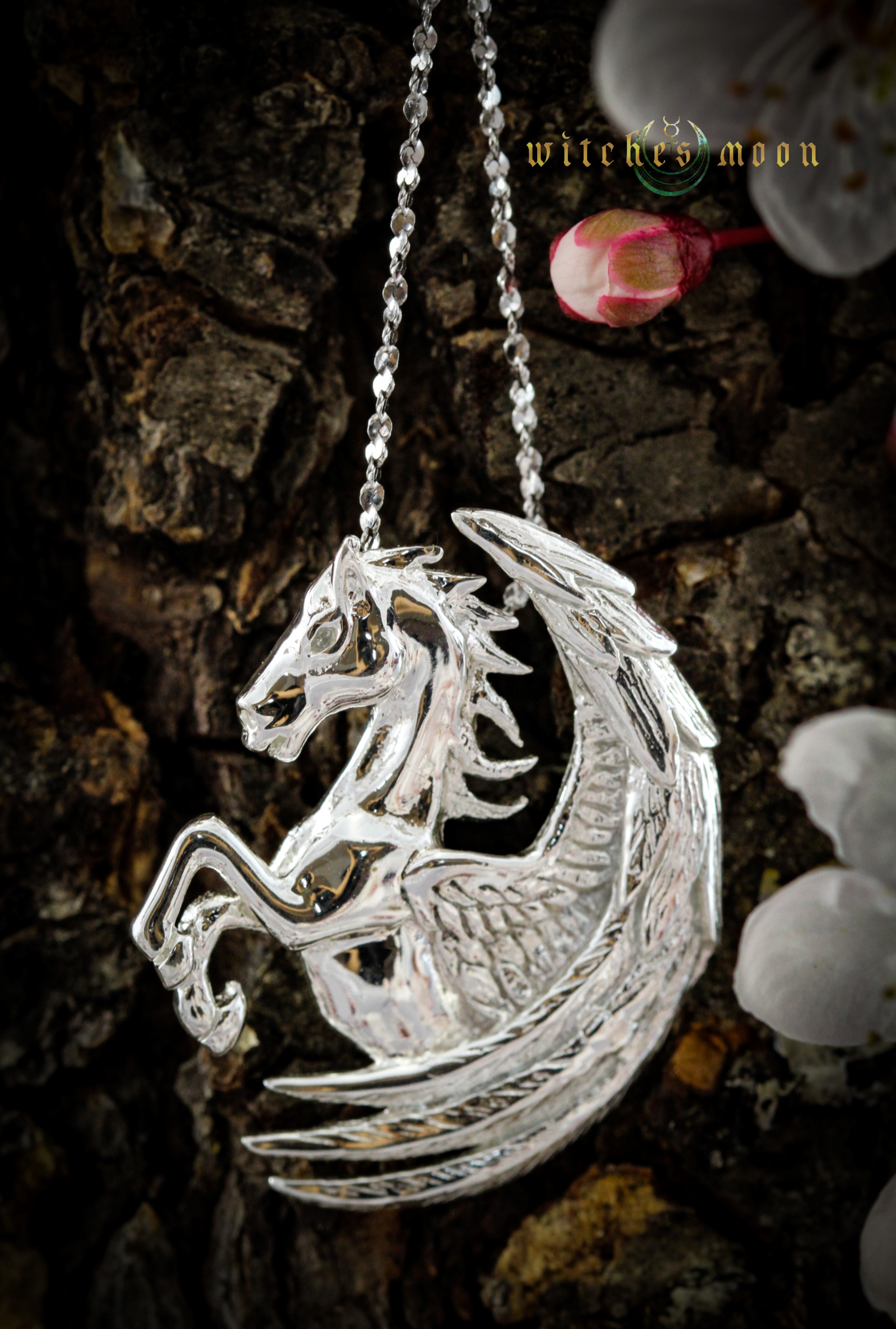 Immortal Pegasus, the fabled winged horse, devoted protector of the Muses, is pictured rearing and ready to launch into adventure. His flight on a secret quest helps the wearer surmount obstacles.