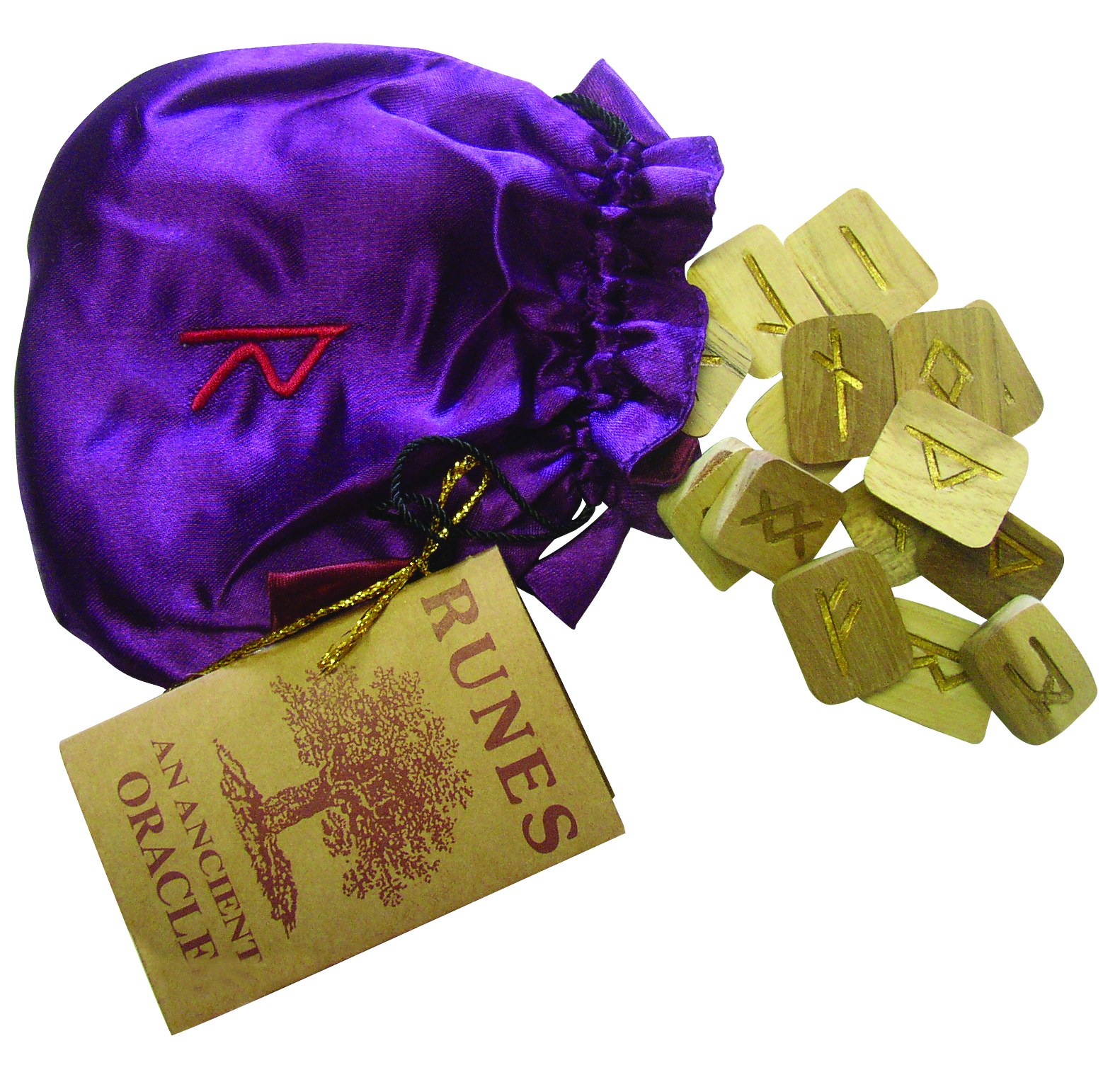 Wooden Runes: A full set of 25 traditional wooden runes in a lined embroidered satin bag. Each set comes with an instruction booklet explaining the meaning of each rune and how to do rune castings.