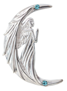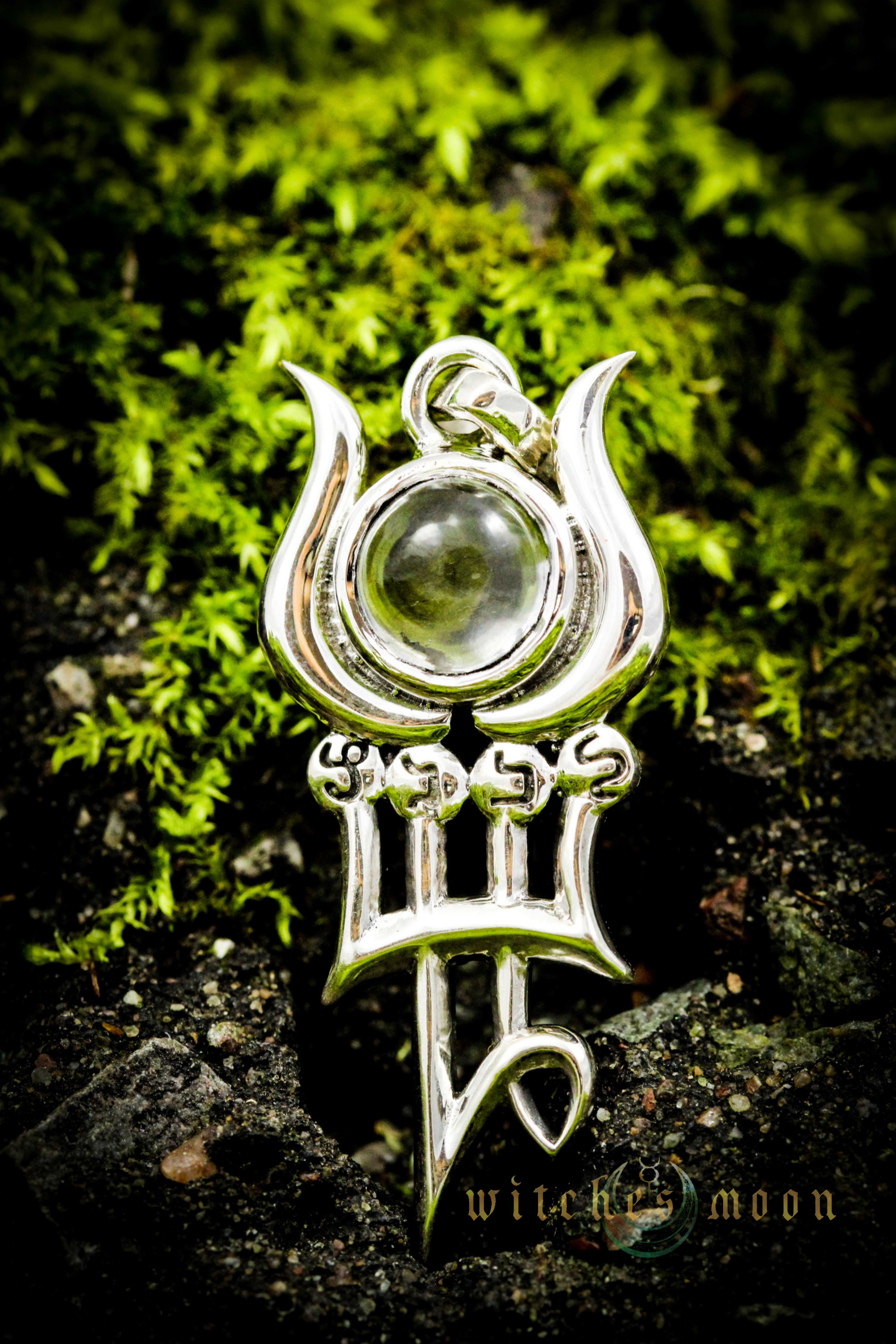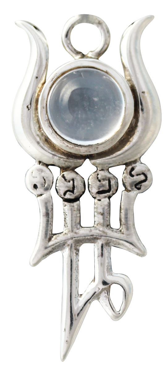 The quartz stone is surrounded by the horns of the cusp of the moon and is mounted on the moon's planetary spirit, Phul. The four hebrew letters stand for Levanah, which means "moon".